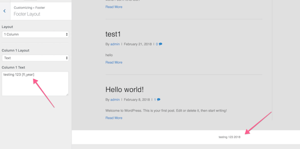 Choose Text for the layout type, then enter the text plus shortcode into the text box. In this example, it's testing 123 [fl-year]. A typical example of a footer using this shortcode would be: