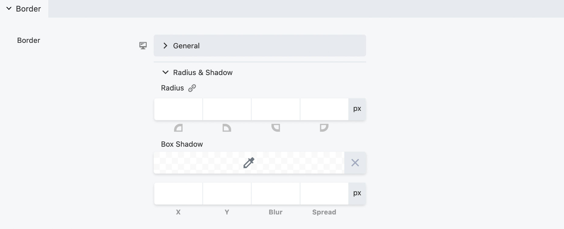 Set the box-shadow of a row, column, or module using the px CSS unit. When you click on any of the Box Shadow value fields, a slider appears allowing you to quickly adjust the value. You can also type a Box Shadow value.