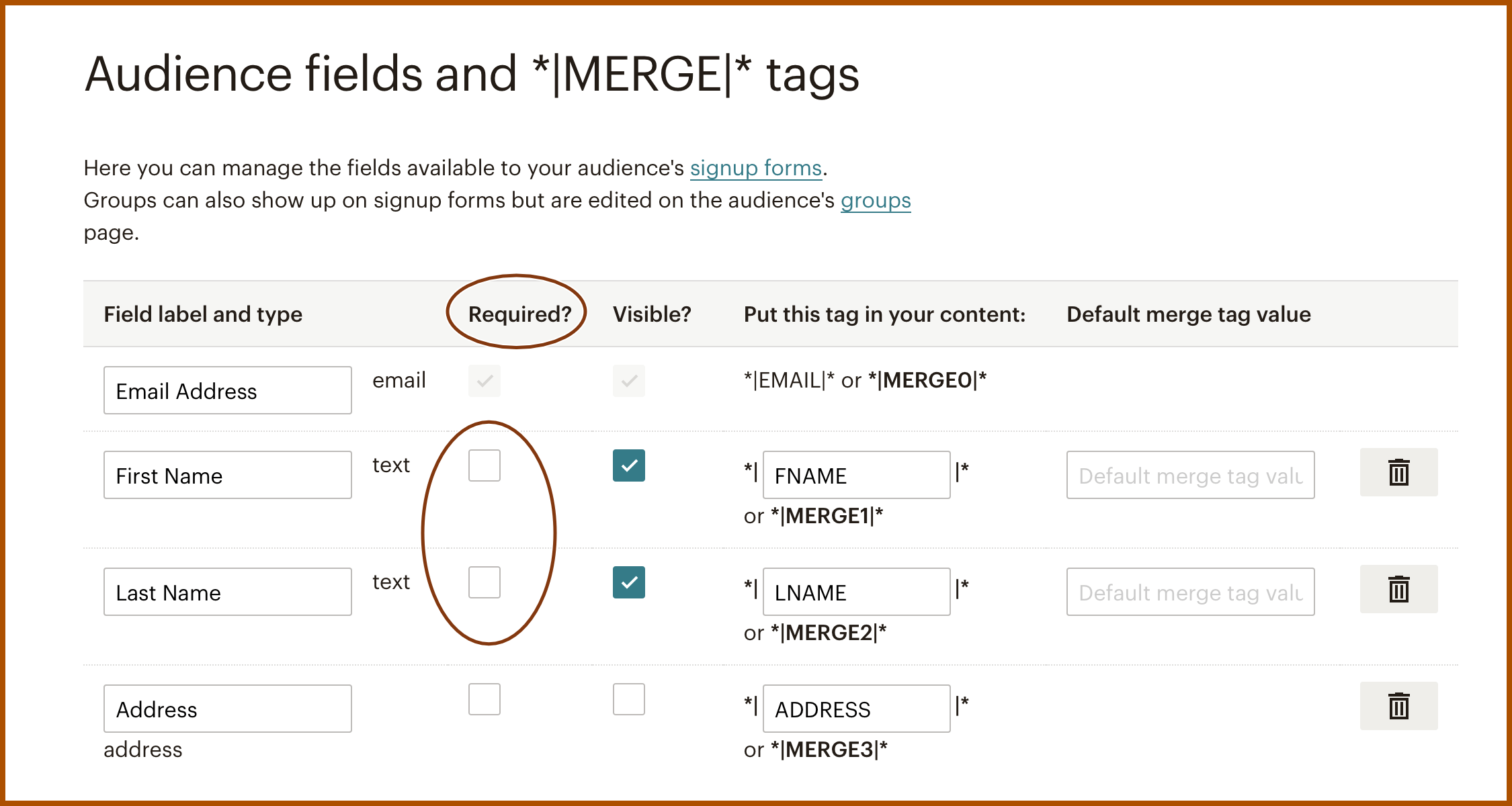 2. Go to the Audience dashboard, then on the Settings tab, choose Audience fields and *|MERGE|* tags.