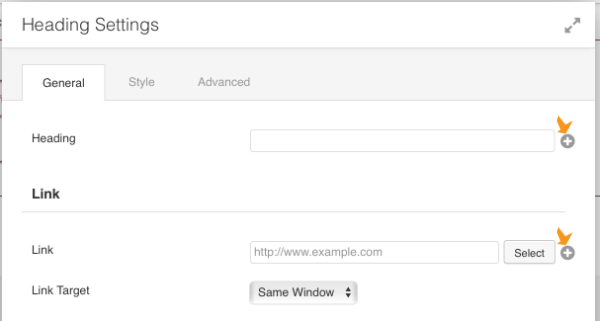 When you open a module for editing in a Themer layout, you'll notice a plus sign next to some of the setting fields, as you can see in the following screenshot.