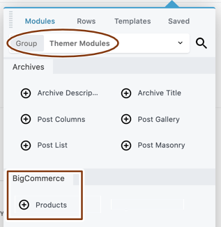 • A Products module from the BigCommerce section in the Themer modules group.