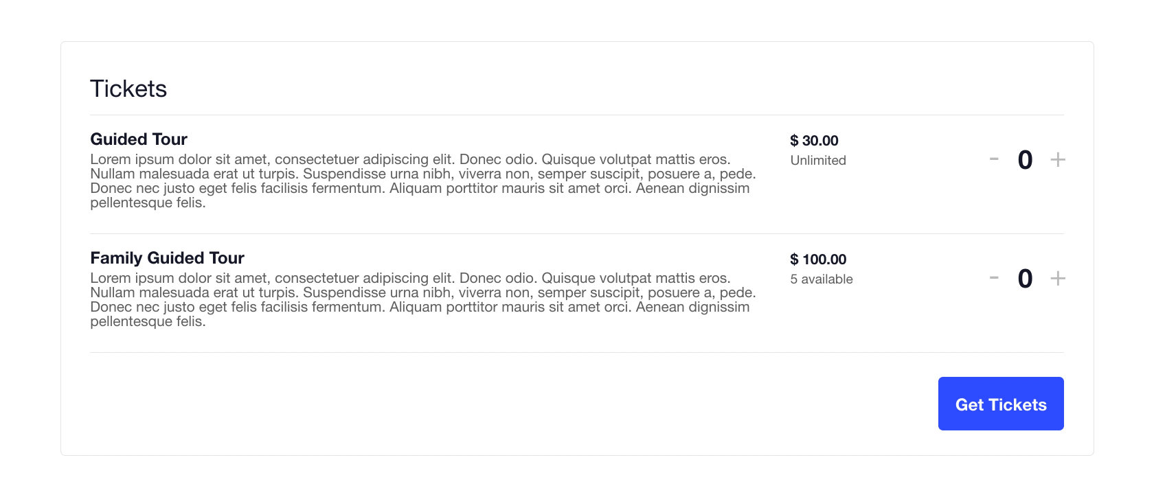 The Events Tickets module displays an event's ticket information and fees for any tickets created.